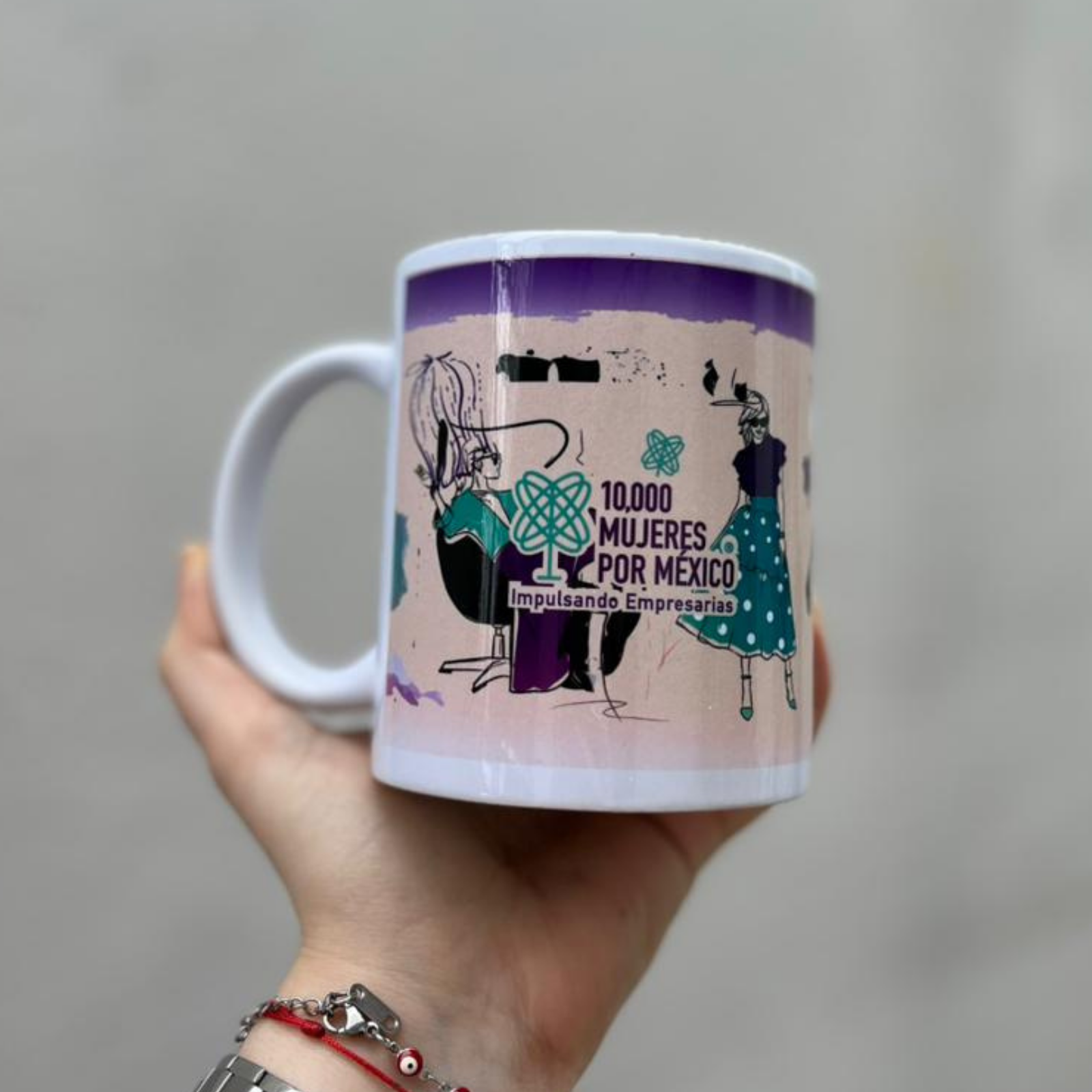 Taza de cerámica con ilustración artística inspirada en el emprendimiento femenino. Ideal para acompañar tu día con un recordatorio del impulso y la fuerza de las mujeres empresarias de México. Acabado resistente y colores vibrantes.