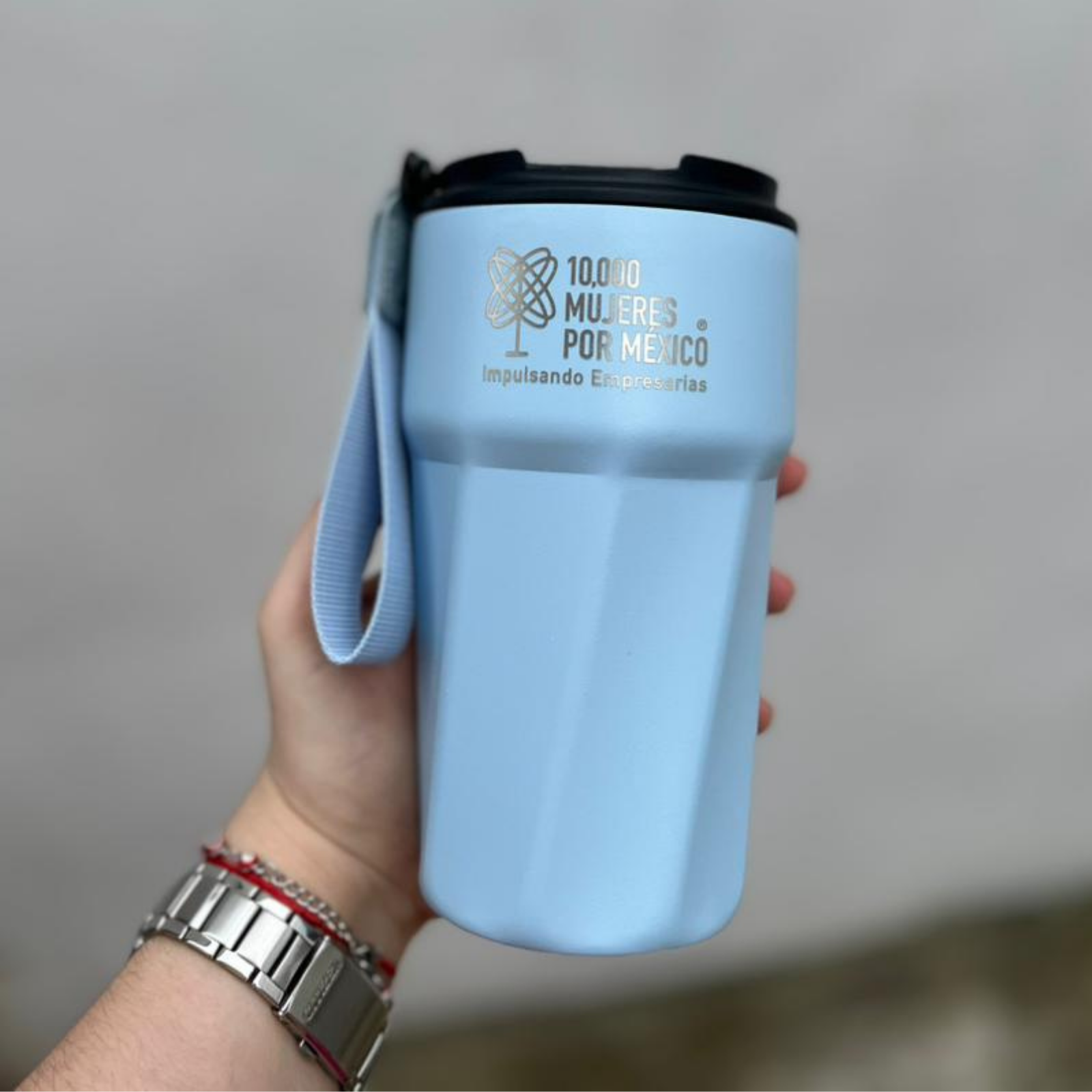 Termo compacto y ligero con correa textil para fácil transporte. Su acabado suave al tacto y diseño minimalista lo hacen perfecto para llevar tus bebidas a donde vayas, mientras apoyas el impulso al emprendimiento femenino en México.